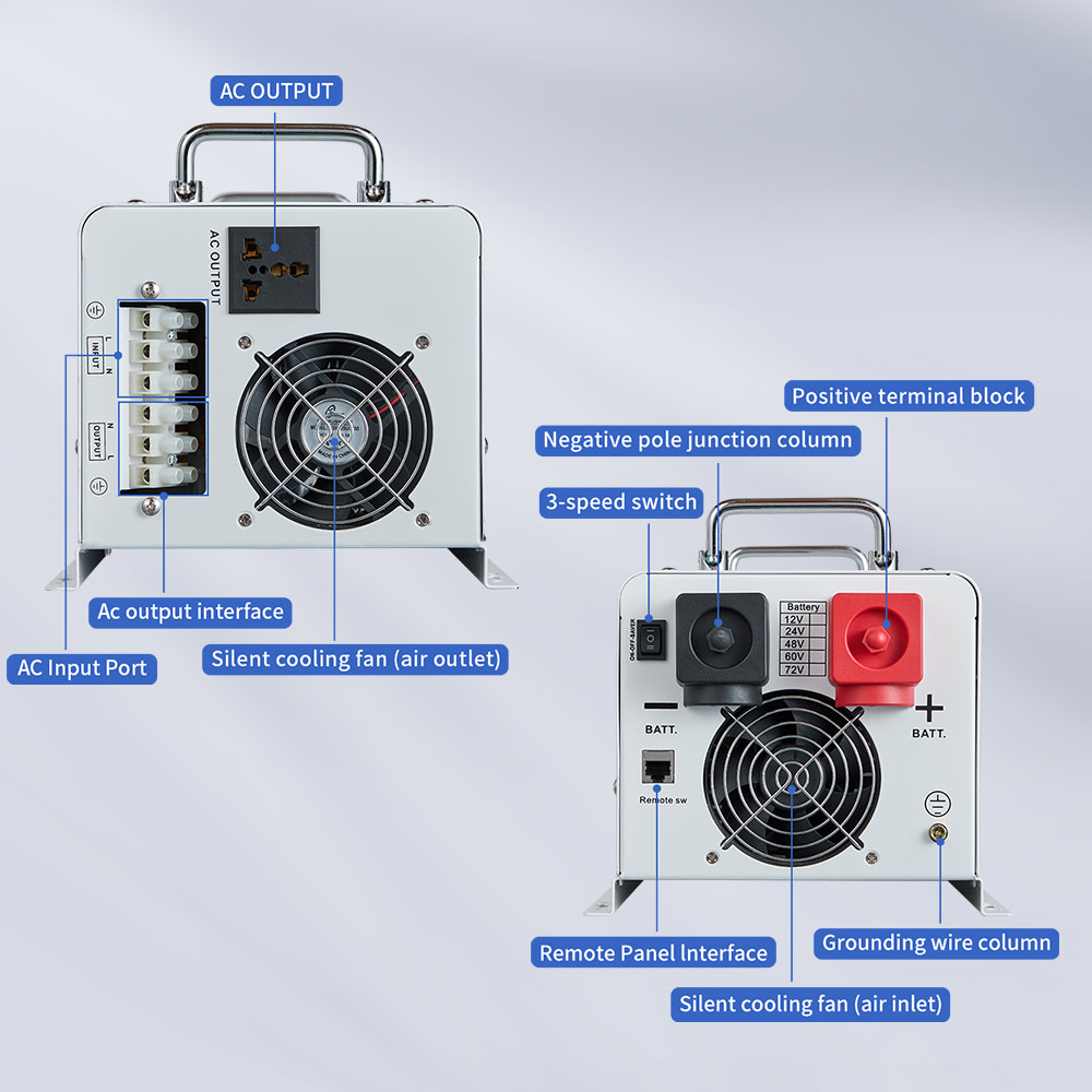 ● 4KW 5 kW 6 kW 7 kW 8kW Industrial Frequency Wechselrichter: 7 Arbeitsmodi, in den Netzen \ Solar \ energiesparender Modus, alle mit unbeaufsichtigter Generator, Hintergrundbeleuchtung und Ausgangsmodus bei Bedarf einstellbar; Neue Statusanzeigeleiste, Selbstprüfungsfehler, Neustartfunktion;